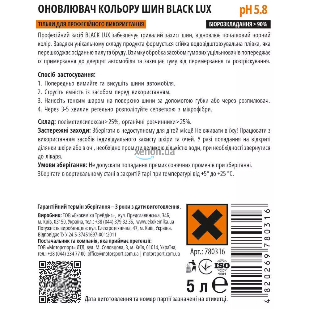 Обновитель цвета шин "Black Lux" от Ekokemika Pro-Line – это профессиональное средство для восстановления и поддержания насыщенного черного цвета шин. Объем 5 литров. Продукт обеспечивает глубокий черный оттенок, защищает резину от ультрафиолета и предотвращает появление трещин. Идеально подходит для регулярного ухода за шинами, придавая им ухоженный вид. Благодаря большому объему, средство экономично в использовании и подходит для профессионального применения на автомойках, в сервисах и автопарках.