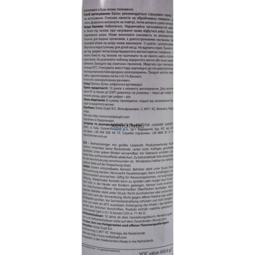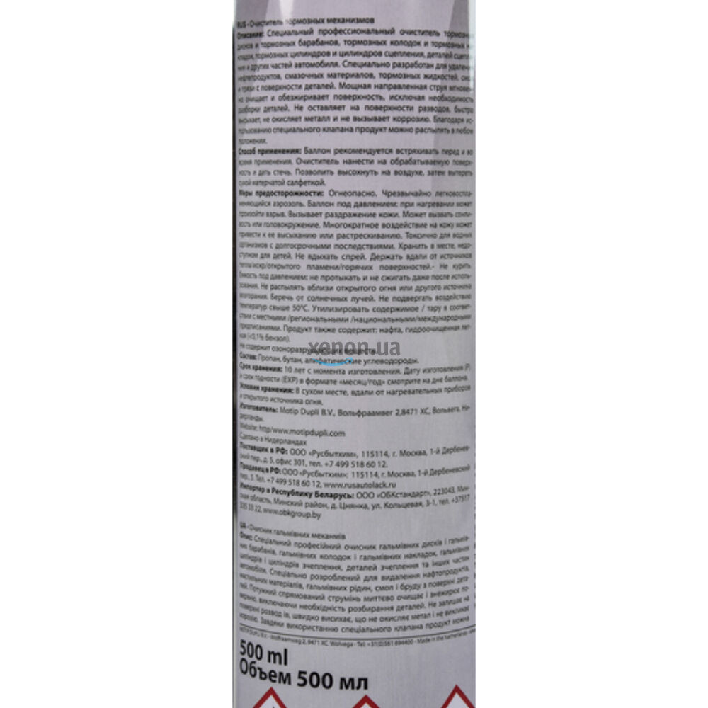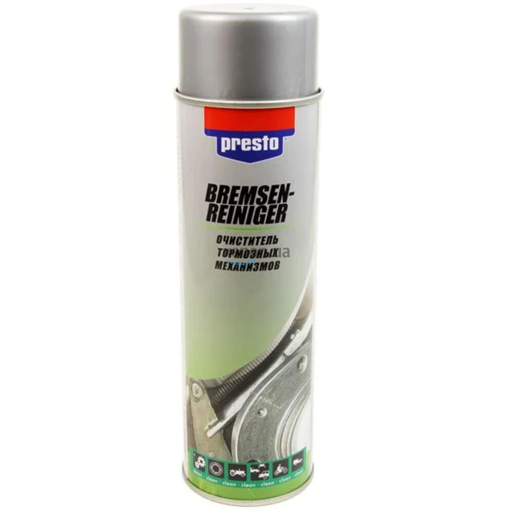 Очиститель тормозной системы Presto Bremsen Reiniger 217609 500 мл - для очистки тормозных дисков, барабанов, колодок, накладок, цилиндров, деталей сцепления и других частей автомобиля. Удаляет нефтепродукты, смазку, тормозную жидкость, смолы, грязь с деталей. Мощная струя мгновенно очищает и обезжиривает поверхность. Не оставляет разводов, быстро высыхает, не вызывает коррозию