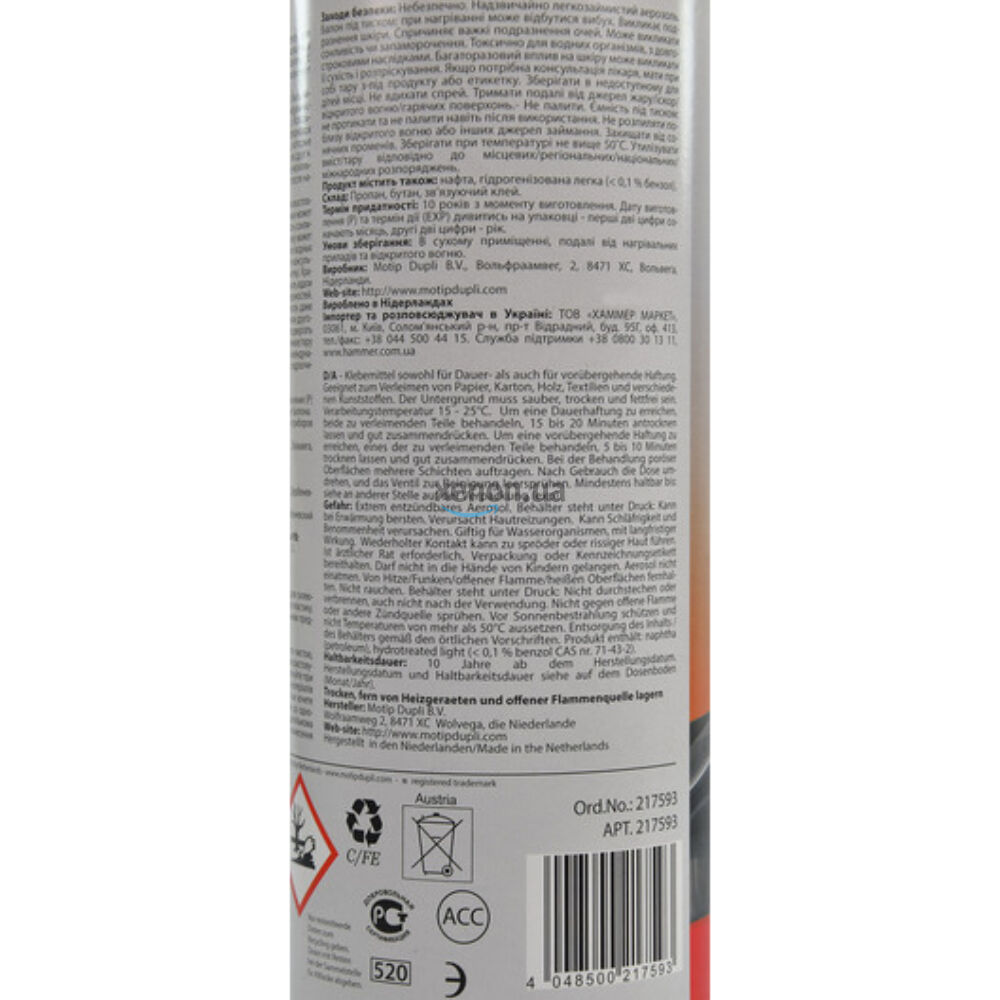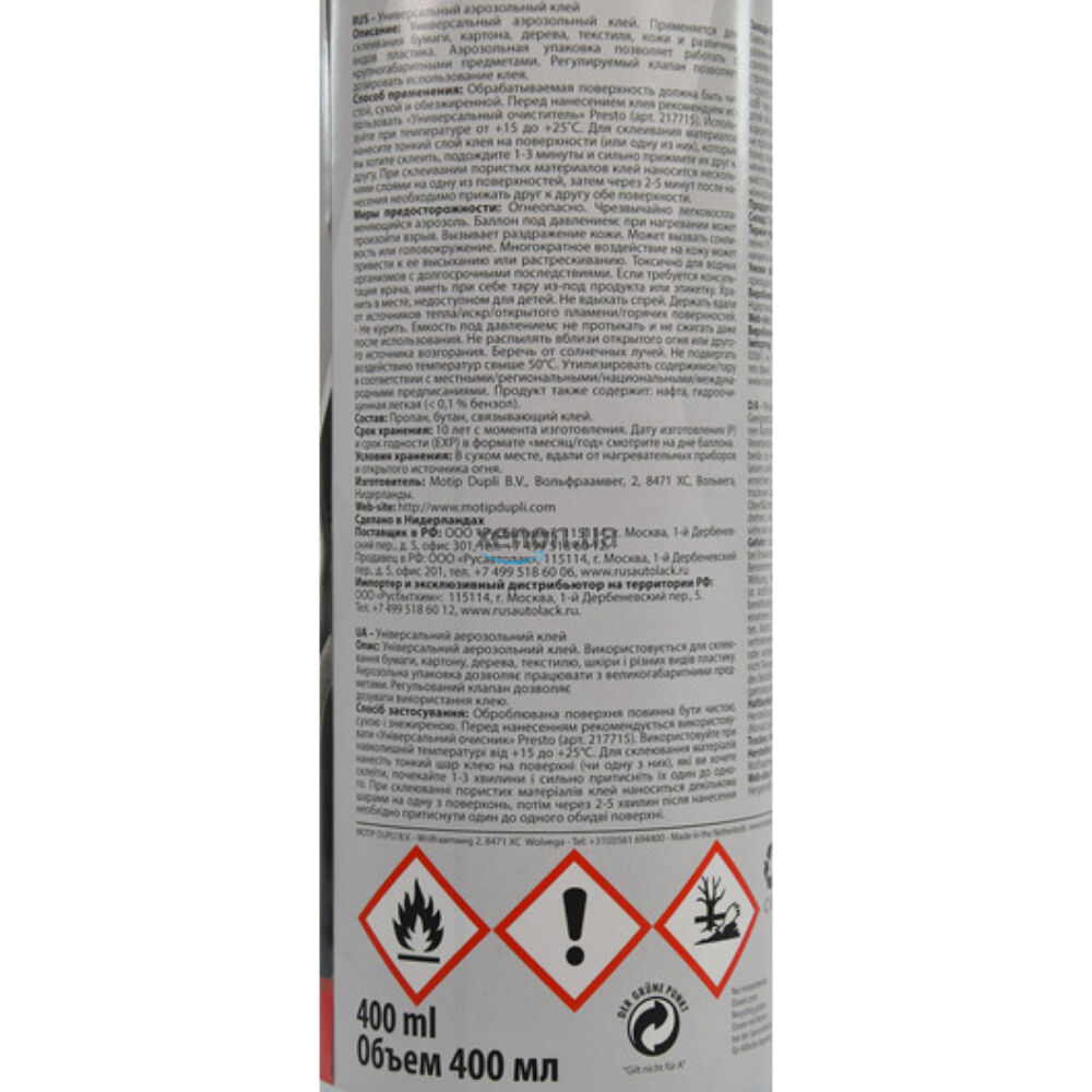 Универсальный аэрозольный клей Presto Klebe Spray 217593 400 мл - универсальный аэрозольный клей применяется для склеивания бумаги, картона, дерева, текстиля, кожи и различных видов пластика. Аэрозольная упаковка позволяет работать с крупногабаритными предметами. Регулируемый клапан дает возможность дозировать нанесение клея.