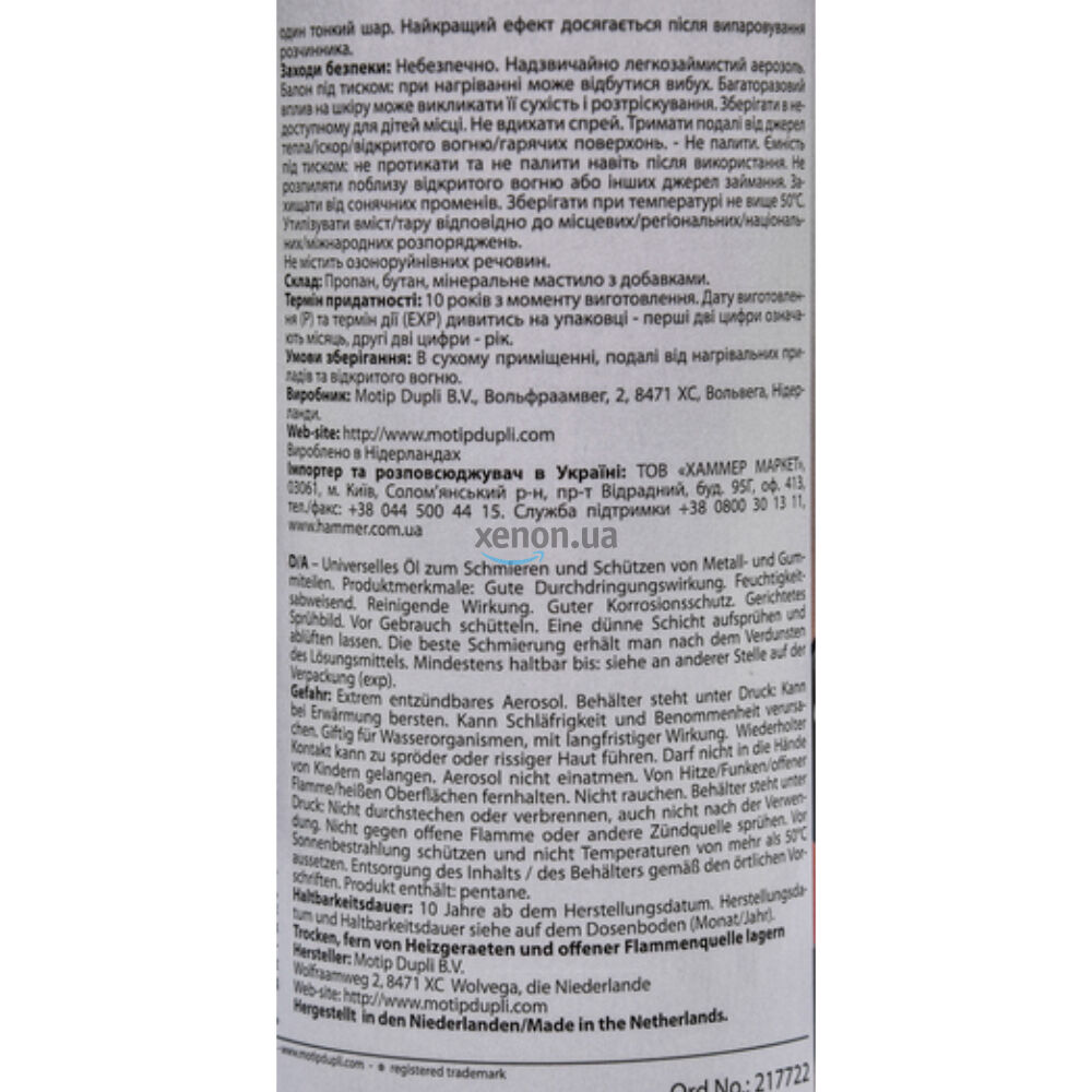 Многофункциональная универсальная смазка Presto MD-40 Multifunktions Spray 157165  400 мл - многоцелевая смазка с широким спектром действия. Быстро отпускает приржавевшие болты и гайки, одновременно смазывая их. Вытесняет влагу, защищает электрические цепи от воздействия влаги. Действует как моющее средство. Предотвращает коррозию и окисление. Смазывает резиновые уплотнители, препятствует их замерзанию и прилипанию. Устраняет скрипы. Устойчива к температурам от –50°С до +250°С.