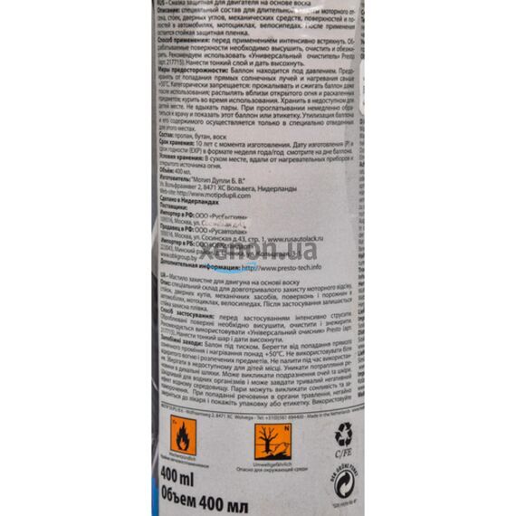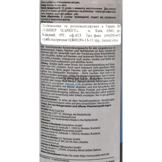 Смазка для защиты моторного отсека и трудно доступных участков авто- и мото- техники Presto Motorschutz Wachs 217968 400 мл - специальный состав для длительной защиты от коррозии моторного отсека, стоек, дверных углов, механических средств, поверхностей и полостей в автомобилях, мотоциклах, велосипедах. После применения остается стойкая защитная пленка.