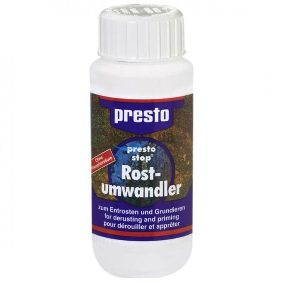 Преобразователь коррозии Presto Rost Unwandler 603079 250 мл. Быстро растворяет и преобразовывает в грунт черного цвета даже старую и плотную ржавчину и не дает образовываться подпленочной коррозии. Грунт хорошо отталкивает воду и улучшает адгезию красок или лаков. Преобразователь ржавчины Presto подходит для обслуживания авто, мотоцикла, велосипеда и домашнего использования.