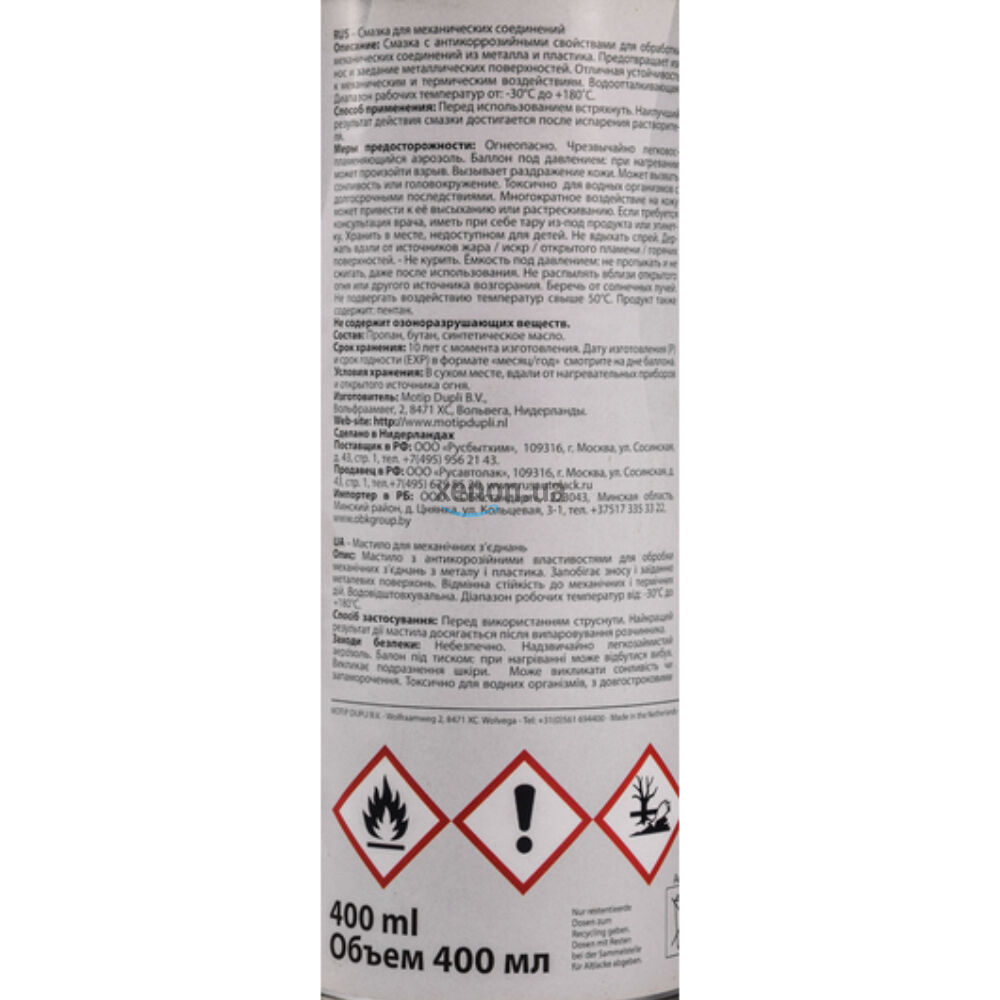 Смазка для механических соединений Presto Spruhfett Weiss 217791 400 мл - смазка с антикоррозийными свойствами для обработки механических соединений из металла и пластика. Предотвращает износ и заедание металлических поверхностей. Отличная устойчивость к механическим и термическим воздействиям. Водоотталкивающая. Рабочий диапазон температур — от –30°С до +180°С.