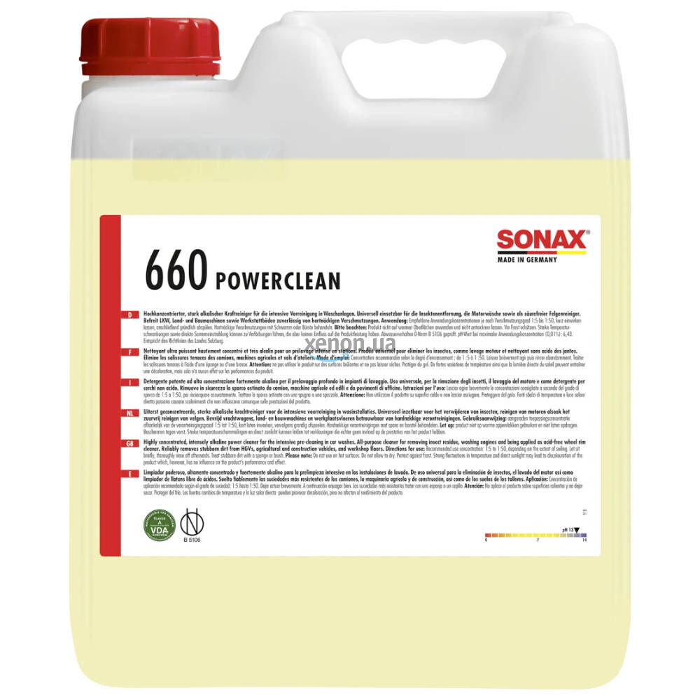 Сильнощелочной, высокоэффективный чистящий концентрат SONAX PowerClean 660600 для мощной предварительной очистки в автомойках и автомойках самообслуживания. Не содержит NTA и фосфатов, быстро и легко отделяется. Также подходит в качестве бескислотного очистителя колесных дисков, для мытья щеток и грузовых автомобилей. рН 13,5.