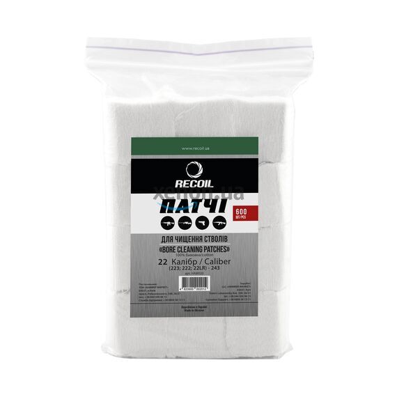 Патч квадратной формы для чистки стволов. Предназначен для чистки стволов калибра 22 (223, 222, 22LR...) - 243 600 шт. Патчи от торговой марки Recoil изготовлены в Украине из высококачественного хлопка. Позволяют быстро и надежно очистить ствол практически любого стрелкового оружия, представленного на рынке.