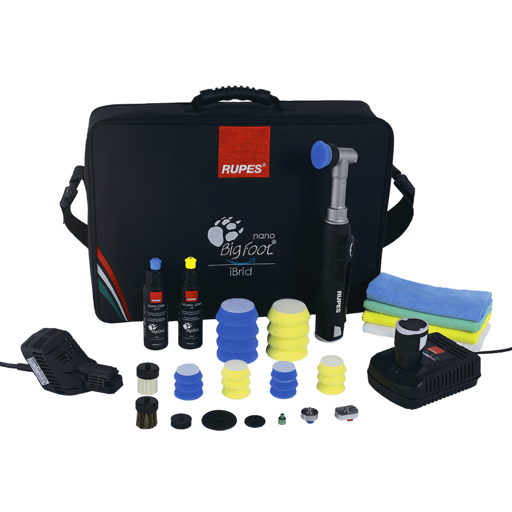 RUPES iBrid Nano — самое универсальное устройство на рынке. Может работать как от кабеля питания, так и от аккумуляторной батареи входящей в комплект. С помощью сменных насадок меняется принцип полировки, на выбор три типа вращения: эксцентрик 3 мм, эксцентрик 12 мм и ротор. Типы вращений можно совмещать с подошвами разного диаметра, на выбор 34 мм либо 50 мм. Кроме этого, в комплект входят щётки для очистки поверхностей: пластик, кожа, алькантара, ковролин.