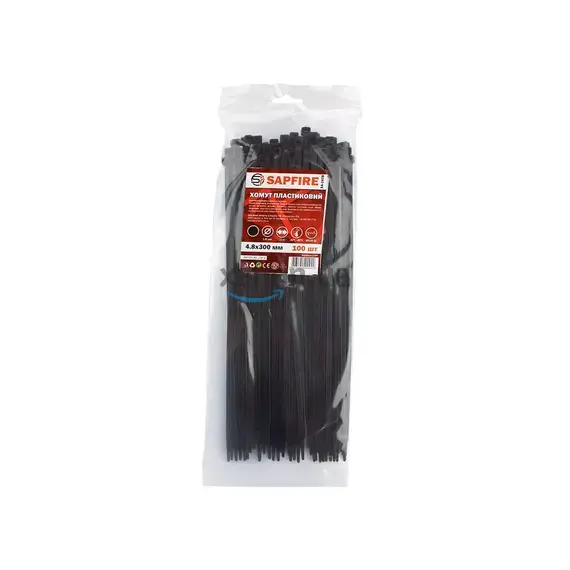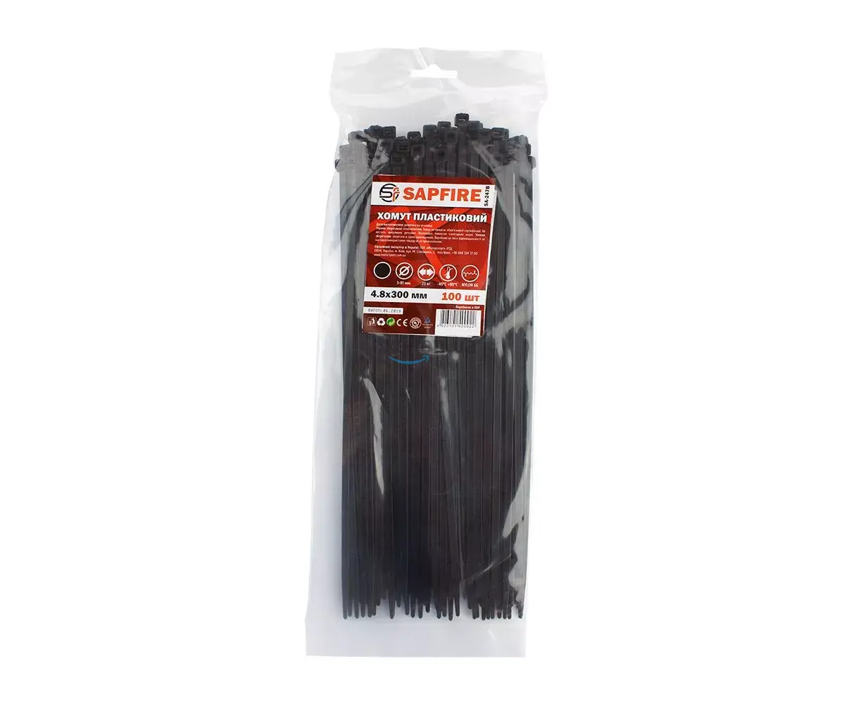 Хомут пластиковый 4,8х300 мм 100 шт чёрный SAPFIRE (400922) — изготовлен из прочного материала Nylon-66 (разновидность полиамида) с высокими электроизоляционными характеристиками, стойкий к УФ-излучению.