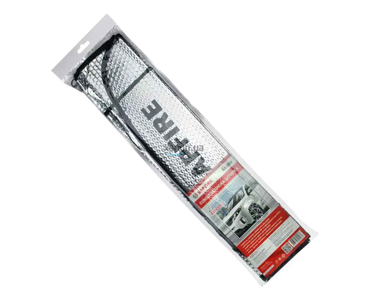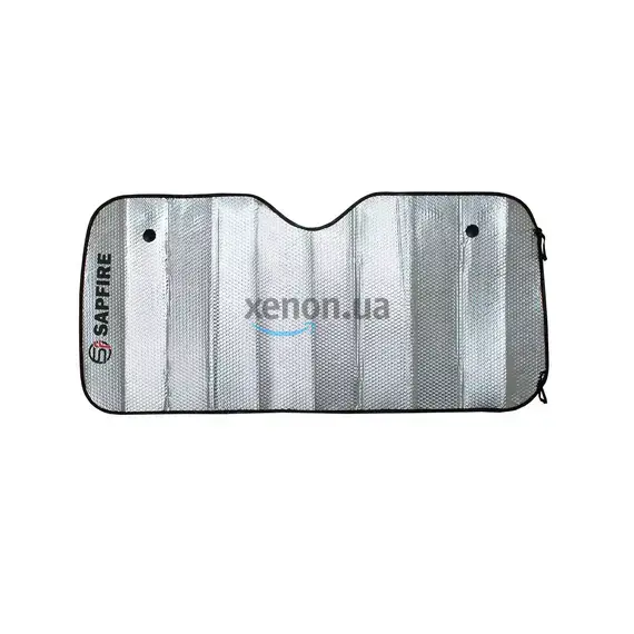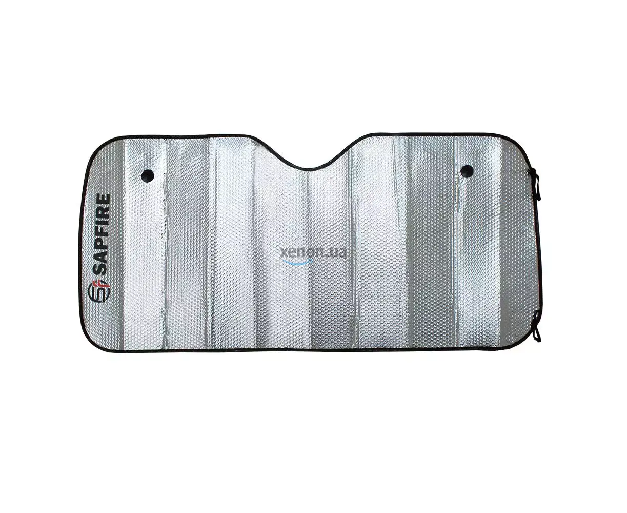 Солнцезащитная шторка на лобовое стекло 130x60 см SAPFIRE (400960) автовладельцы используют для предотвращения попадания прямых солнечных лучей в салон автомобиля. Специальная серебристая поверхность отлично отражает свет и предотвращает повышенный нагрев приборной панели. Благодаря присоскам шторка легко и быстро крепится к лобовому стеклу. Размер 130х60 см отлично подходит для многих моделей легковых автомобилей.