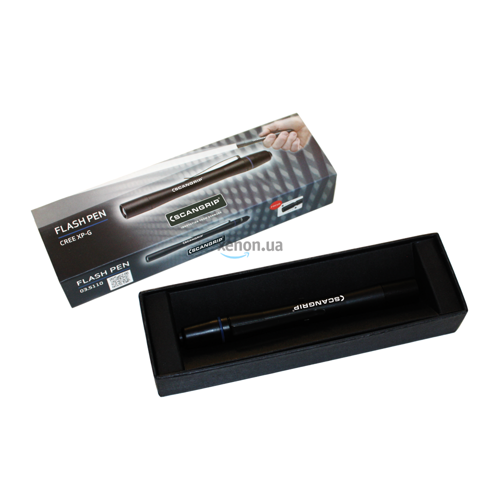 Scangrip Flash Pen — ручной инспекционный фонарик на батарейках. Оснащён функцией фокусировки светового луча и обеспечивает световой поток 100 люмен. Луч света преодолевает расстояние до 7.5 метров. Комплектуется двумя батарейками ААА.