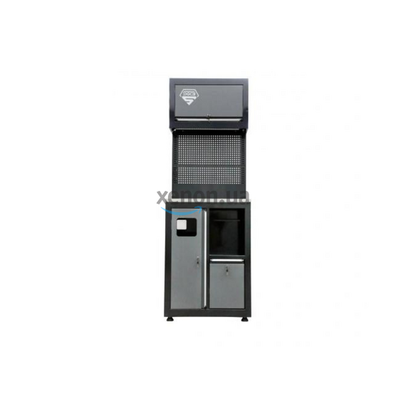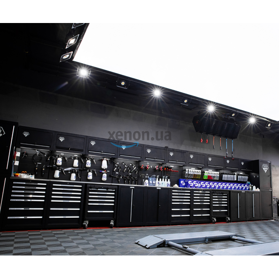 Вертикальные стенки – из перфорированной стали. На них можно разместить крючки для подвеса инструментов, кабелей, щёток, кистей, кругов и другого оборудования. Все ящики и дверцы закрываются на замок. Настенные шкафы – со встроенной диодной подсветкой. Весь набор оснащён регулировочными винтами для установки на неровных полах.