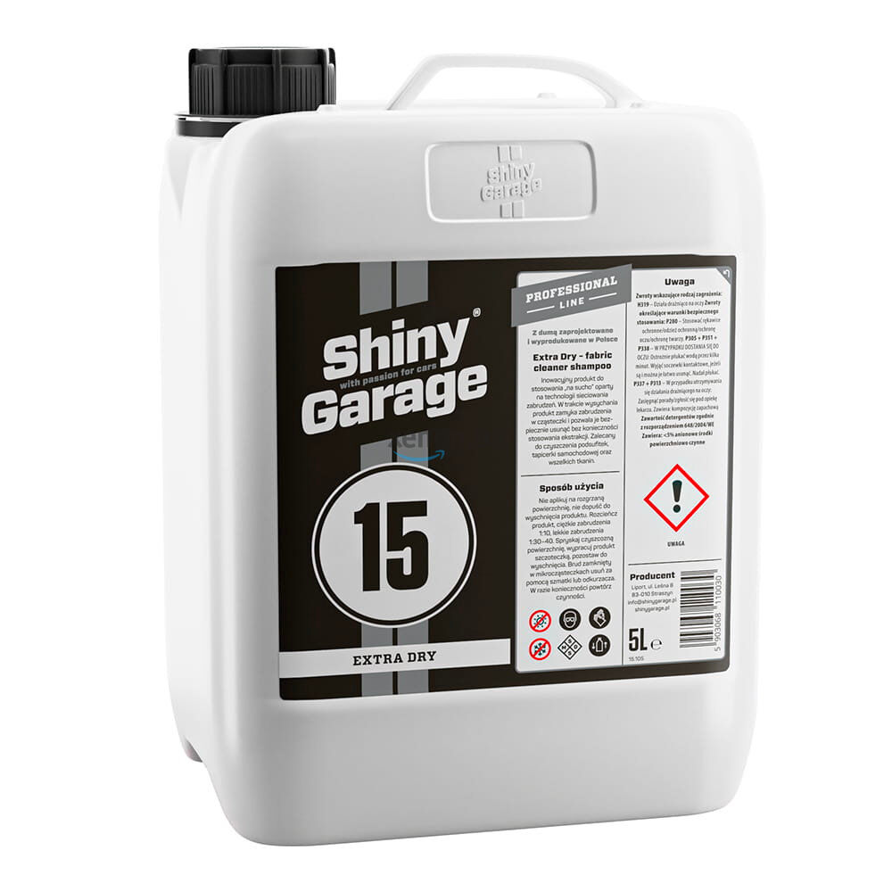 Shiny Garage Extra Dry Fabric Shampoo. Концентрат. Инновационный продукт, предназначенный для очистки потолка, дверных карт, сидений и всех тканевых элементов чувствительных к намоканию. Средство не требует использования воды для ополаскивания, что гарантирует безопасную работу без риска повредить поверхность. Его эффект основан на технологии «скрепления» грязи, что означает, что во время высыхания продукт скрепляет загрязнения в частицы и позволяет безопасно удалить их сухой фиброй или обычным пылесосом. Теперь не нужно использовать экстрактор.
