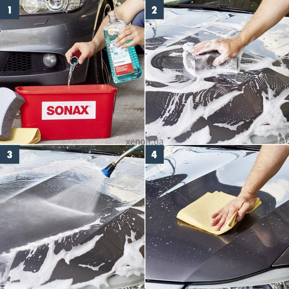 То же самое, но не списком: Шампунь концентрированный, а поэтому его необходимо развести в соотношении 1:100 (100 мл шампуня на 10 л воды) с водой. Перед нанесением на кузов автомобиля, с него нужно сбить грязь под высоким давлением воды. После этого можно равномерно наносить автошампунь на автомобиль и растирать специальной губкой SONAX 428000. Через некоторое время, поверхность автомобиля можно смывать. Затем его необходимо вытереть салфеткой SONAX 419200, 417700, скребком SONAX 417400 или салфетками из микрофибры. Автомобиль чист и готов к нанесению полиролей и защитных средств, восков.
