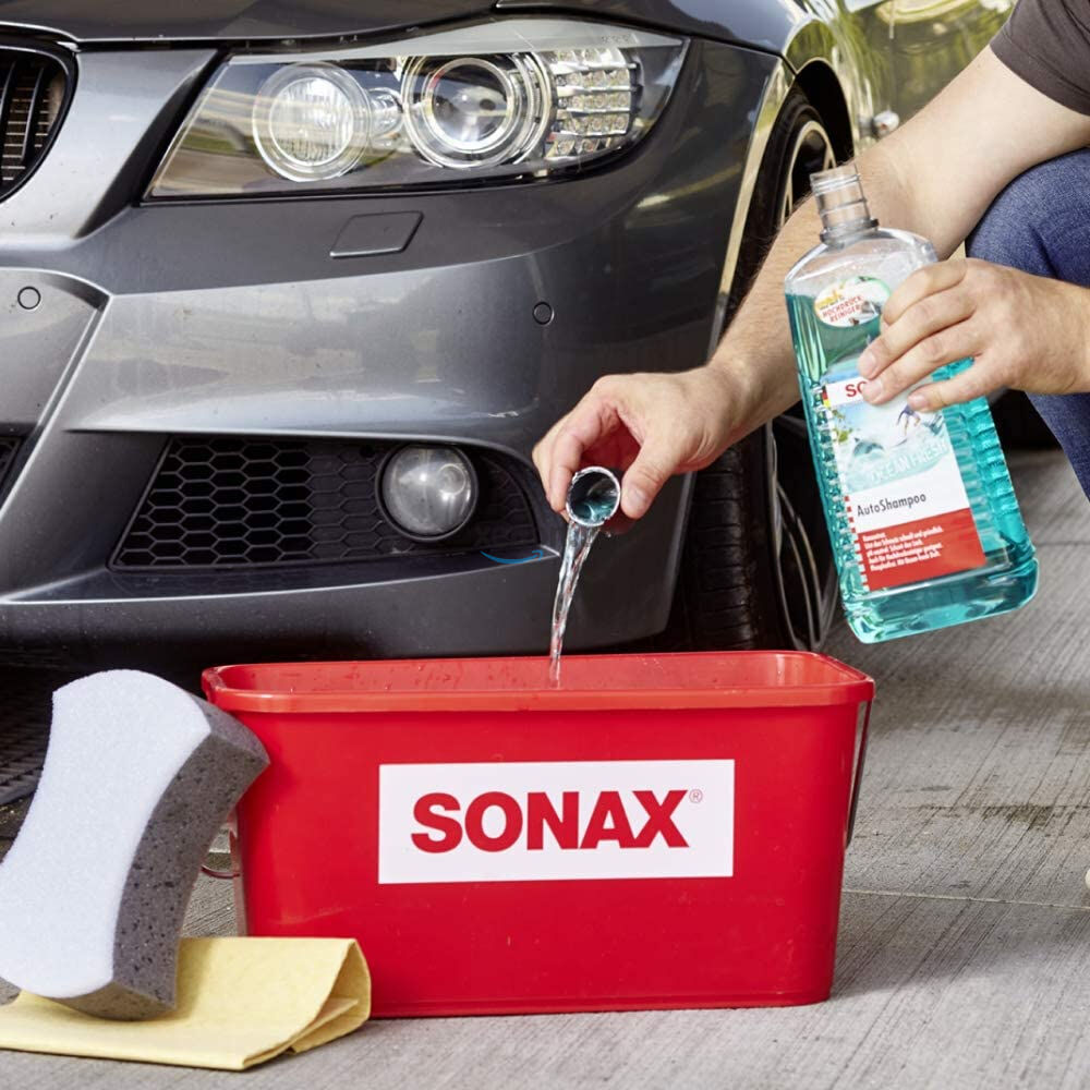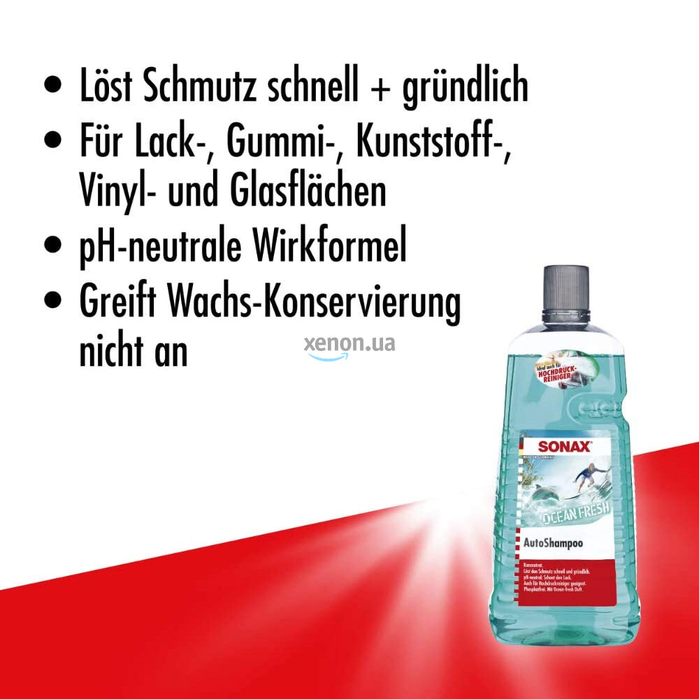 Недорогой автошампунь концентрат с запахом SONAX AutoShampoo Ocean Fresh 325541 в большой упаковке 2л быстро и тщательно удаляет загрязнения со всех лакокрасочных, резиновых, пластиковых, виниловых и стеклянных поверхностей. Формула с нейтральным pH защищает лакокрасочное покрытие и не разрушает существующий защитный восковой слой. Также подходит для использования в очистителях высокого давления. Без фосфатов.