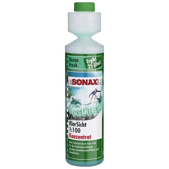 Концентрат омывателя летний (океанская свежесть) SONAX Clear View 1:100 Ocean Fresh 250 мл 388141. Высококонцентрированный осенне-весенне-летний концентрат омывателя 250 мл, позволяет получить жидкость омывателя стекла объемом до 25 литра, хотя многие водители стараются получить больший объем жидкости омывателя, используя концентрат омывателя стекла SONAX. Стоит отметить, что концентраты SONAX для стекол не содержат вредных химических веществ и при их использовании у вас не будет появляться неприятный ядовитый запах в салоне автомобиля.