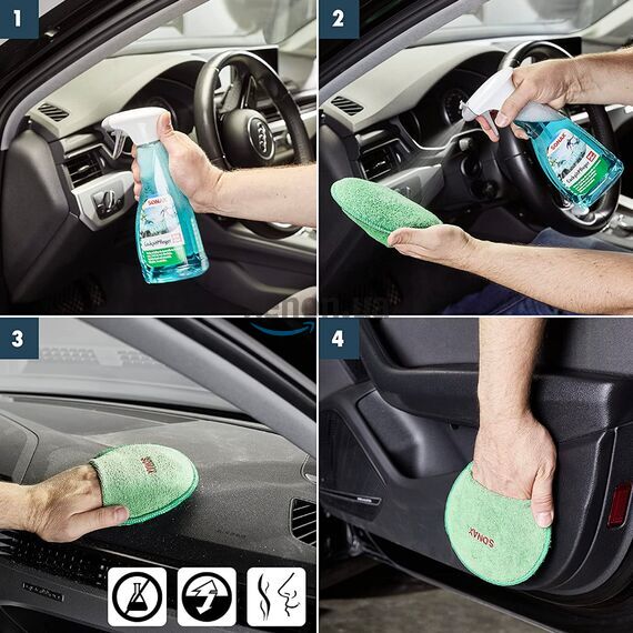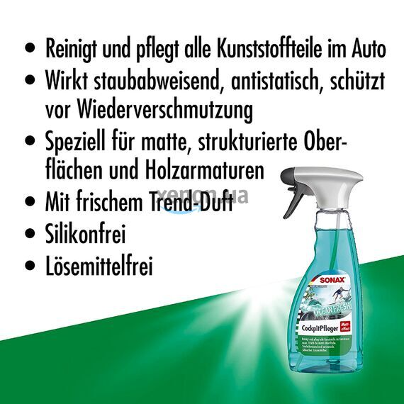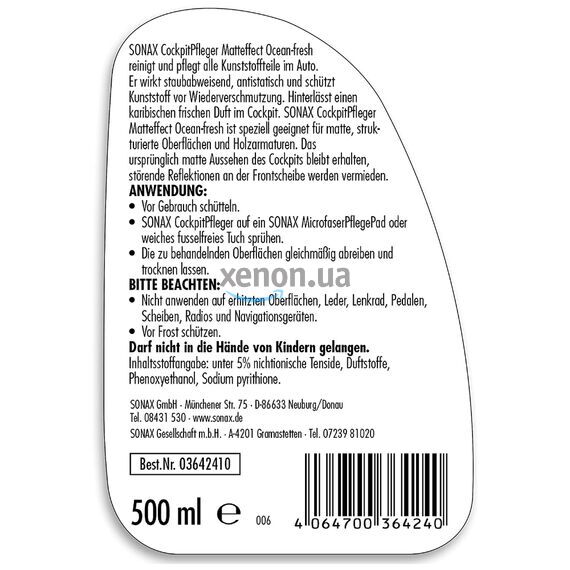 Матовый полироль для пластика (океанская свежесть) SONAX Cockpitpfleger Ocean-Fresh 500 мл 364241. Средство по уходу за салоном автомобиля с матовым эффектом очищает и ухаживает за всеми пластиковыми деталями автомобиля. Пылеотталкивающий, антистатический, защищающий пластик от повторного загрязнения. Оставляет свежий аромат. Cockpitpfleger Matteffect отлично подходит для матовых структурированных поверхностей и деревянной фурнитуры. Сохранен первоначальный матовый вид, отсутствуют раздражающие блики на лобовом стекле.