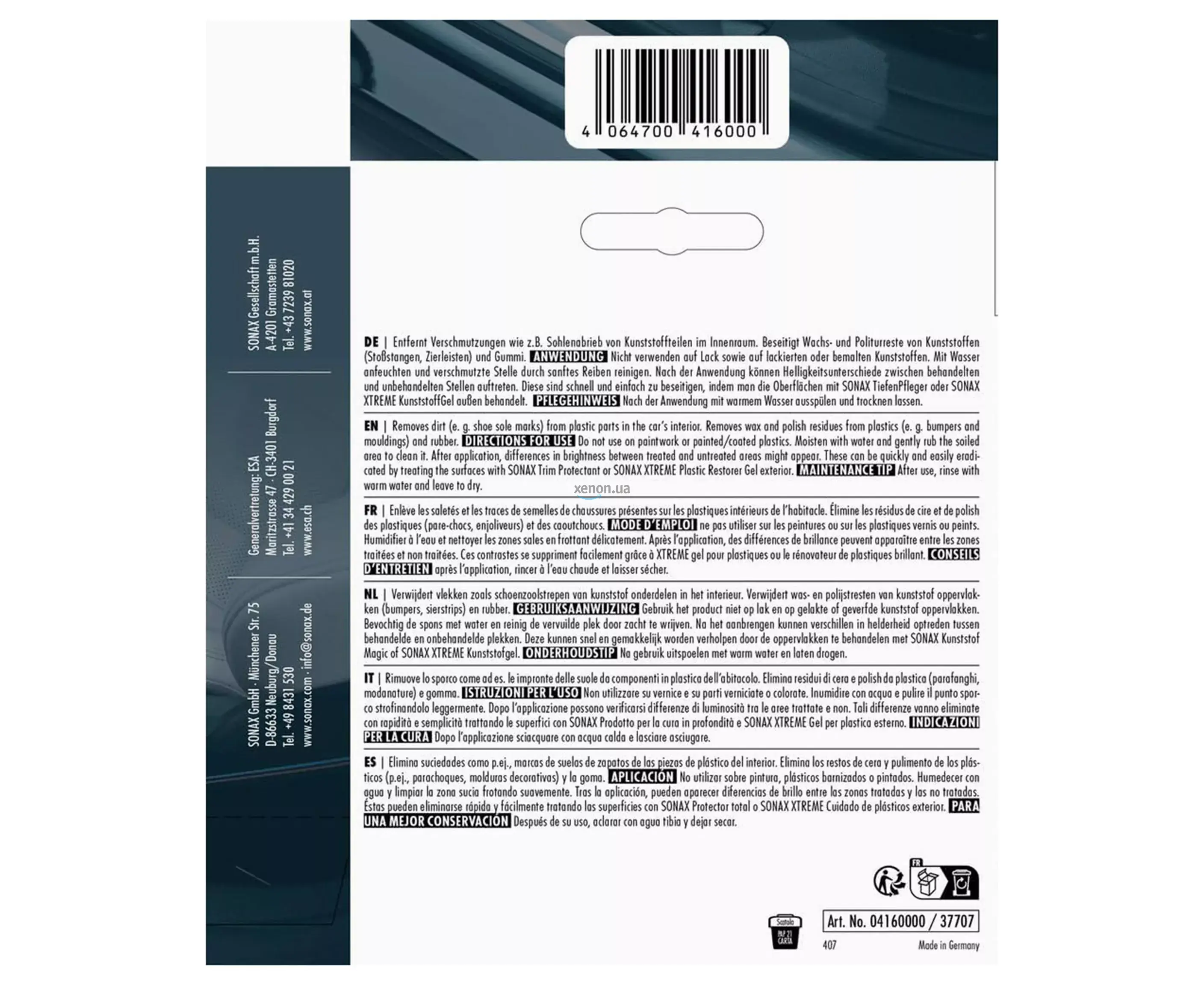 Специальная пористая меламиновая губка SONAX 416 000 для удаления грязи с пластиковых деталей салона автомобиля (например, следов от обуви на дверях). Удаляет остатки воска и полироля с неокрашенных пластиковых (бампер, молдинг) и резиновых деталей.