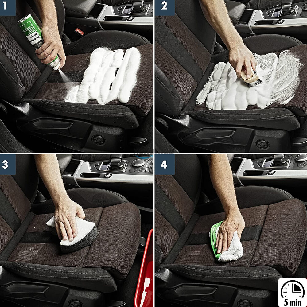 - Распределите пену по поверхности тканевых сидений, потолка автомобиля или текстильных ковриков салона - смотря, что вы очищаете в данный момент;