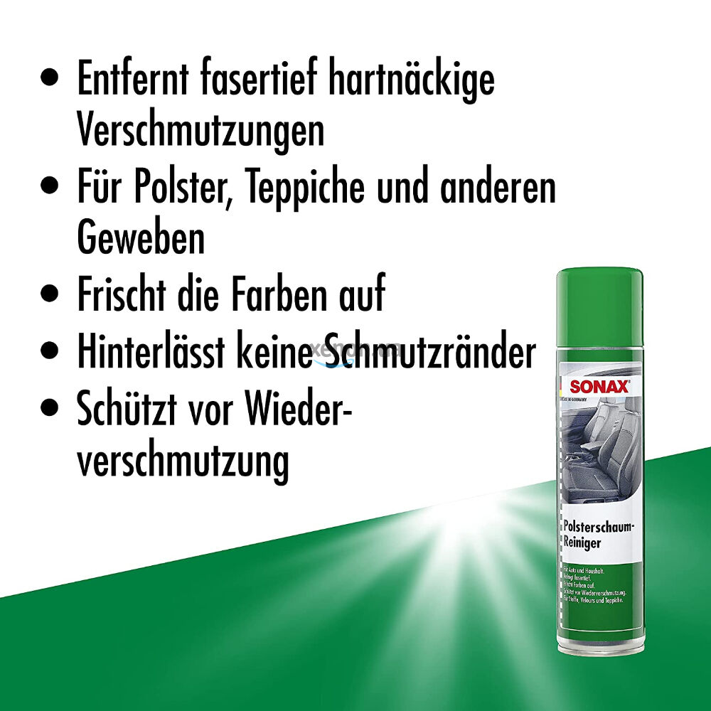 Пенный очиститель пятен текстильного салона SONAX Foam Upholstery Cleaner 400 мл 306200. Удаляет даже стойкие загрязнения с обивки, ковров и других тканей на глубину волокон. Освежает цвета и не оставляет следов грязи. Можно легко пылесосить. Защищает от повторного загрязнения. Глубоко проникает в волокна. Для автомобиля и дома.