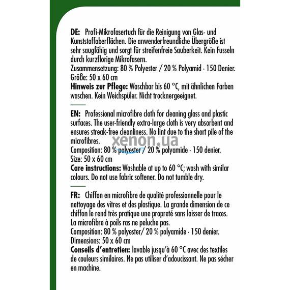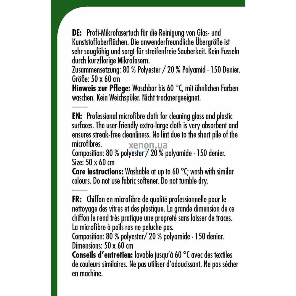 Очень впитывающая, крупноформатная салфетка 50 х 60 см для обработки стеклоочистителей. Обеспечивает чистоту без разводов. Без ворса благодаря микроволокнам с коротким ворсом. 3 салфетки в упаковке.