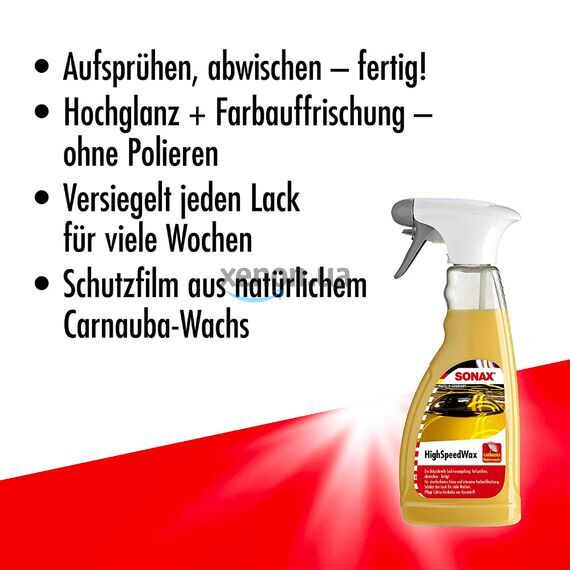 Быстрый воск для автомобиля SONAX HighSpeedWax 500 мл 288200. Молниеносное лакокрасочное покрытие: нанесите, сотрите — готово! Высокоэффективная очищающая и консервирующая эмульсия для любого типа краски. Высококачественный карнаубский воск герметизирует лакокрасочное покрытие в течение многих недель, придает глянцевый блеск без разводов и обеспечивает интенсивное освежение цвета без утомительной полировки. Также идеально подходит для ухода и консервации складных крыш из пластика.
