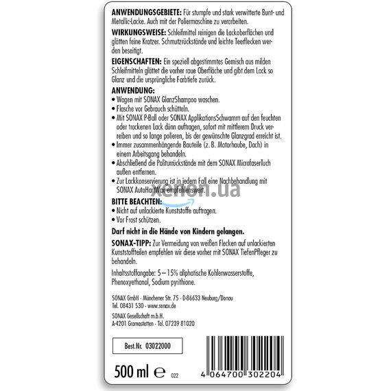Мощный полироль для матовых и сильно выветренных цветных и металлизированных лакокрасочных покрытий. Специальные абразивы очищают окрашенную поверхность и удаляют мелкие царапины. Ранее шероховатая поверхность сглаживается, возвращая краске блеск и изначальную глубину цвета. Остатки грязи и легкие пятна смолы удаляются. Также можно обрабатывать полировальной машиной. Для последующей консервации краски рекомендуется дополнительная обработка SONAX Autohartwax.