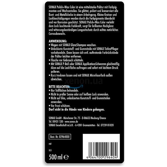 Красный полироль SONAX Polish +Wax Color Red 296400 500 мл с тефлоном (PTFE) и воском для восстановления цвета. Ранее продукт назывался SONAX Polish & Wax NanoPro. Также ранее в упаковках на 500 мл были восковые карандаши, после обновления ушла и приставка NanoPro из названия, и карандаш из большой упаковки.