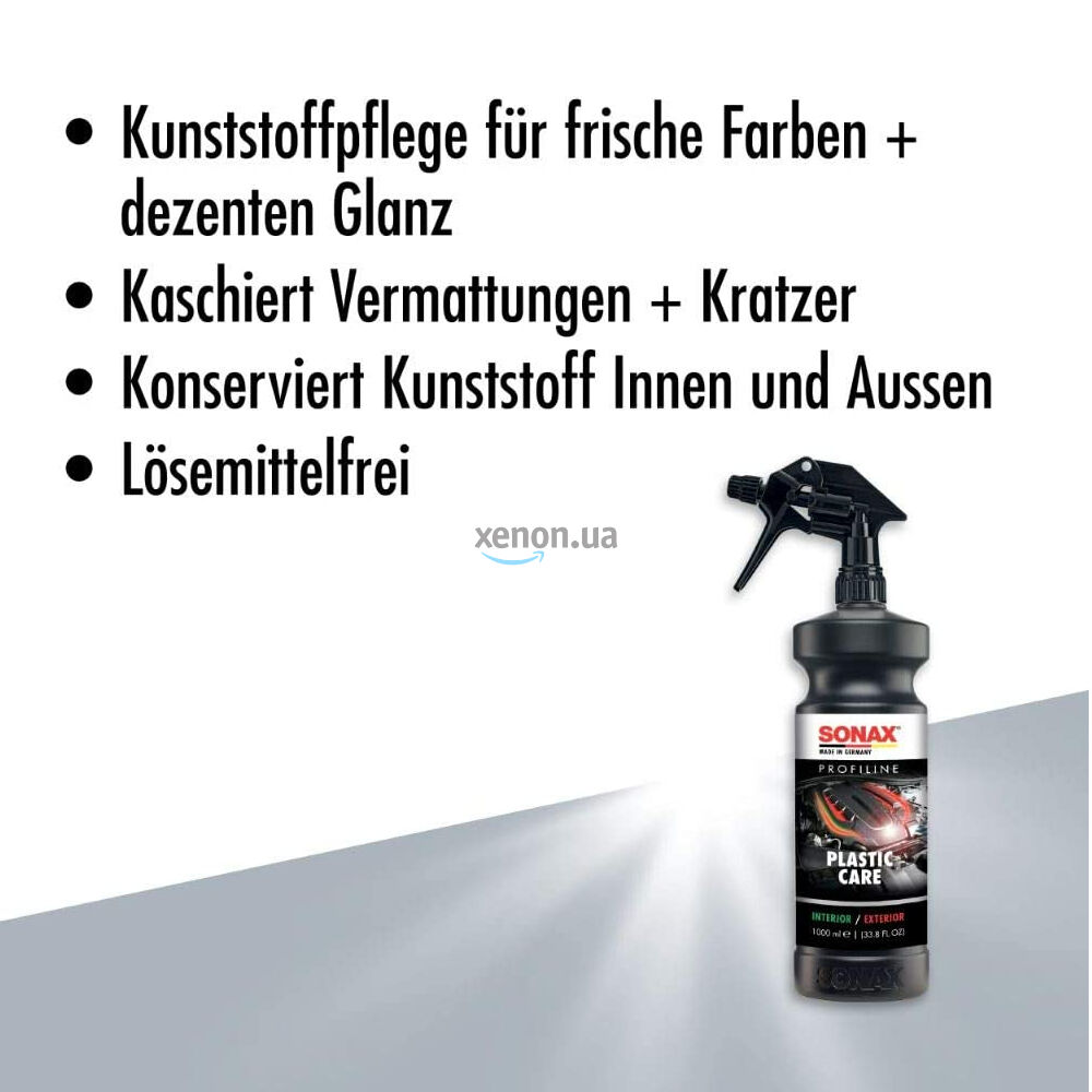 Очиститель наружного и внутреннего пластика матовый SONAX PROFILINE Plastic Care 1 л 205405. Уход за пластиком для профессионального автосервиса. Освежает цвета, придает легкий блеск и скрывает матовость и царапины. Сохраняет весь пластик в салоне автомобиля. Оптимальный консервант моторного отсека. Без растворителей. Самое простое применение сразу после мойки двигателя. Также можно использовать для внешней отделки автомобиля.
