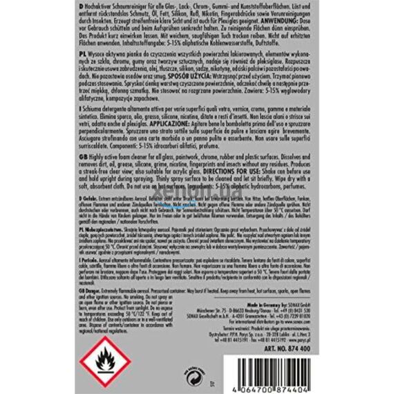 Универсальный пенный очиститель салона SONAX PROFILINE Universal Foam Cleaner 500 мл 874400. Высокоактивный пенный очиститель для стеклянных, лаковых, резиновых и пластиковых поверхностей. Растворяет и удаляет остатки грязи, жира, масла, силикона, копоти, никотина, а также насекомых. Обеспечивает хороший обзор. Подходит для органического стекла. Не оставляет следов и разводов, обеспечивает прозрачность обзора, может использоваться для очистки плексигласа.