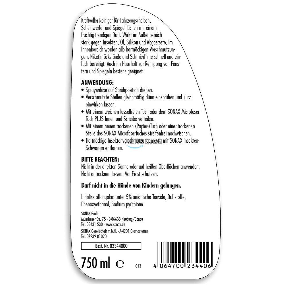 Очиститель стекла, оптики и зеркал SONAX ScheibenStar 750 мл 234400. Эффективный очиститель стекла с приятным фруктовым ароматом. Отлично удаляет любые пятна с поверхностей, включая остатки мошек, битум, почки деревьев, маслянистые и жирные, не оставляет после очистки полос, пятен или голограмм, гарантирует исключительную прозрачность стекла для комфортного и безопасного управления автомобилем в любое время суток.