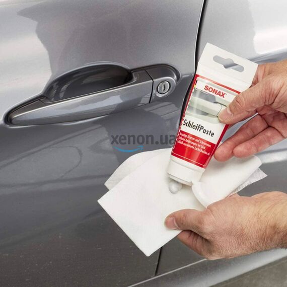 Универсальный антицарапин для ручного исплльзования SONAX SchleifPaste 75 мл 320100. Шлифовальная паста без силикона с высоким содержанием абразивов SONAX SchleifPaste предназначена для шлифования обветренных и поцарапанных слоев краски без применения шлифмашинки. Удаляет небольшие следы повреждения от птичьего помета, насекомых или древесного сока на лакокрасочном покрытии. Из-за достаточно высокой абразивности, происходит быстрый и глубокий съем лака, при этом остается средний эффект блеска. С помощью шлифпасты можно убрать следы шлифовки с наждачной бумаги P1000. Подходит для всех типов и цветов краски.