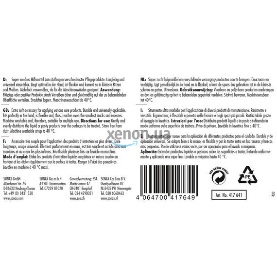 Сверхмягкая губка-аппликатор для нежного и бережного нанесения и распределения воска, полимеров, герметиков и лосьонов SONAX Schwammapplikator Super Soft (417641). Прочный и универсальный. Оптимально лежит в руке, эластичен и проникает в мельчайшие трещинки и полости. Можно использовать много раз, так как его можно стирать в стиральной машине.