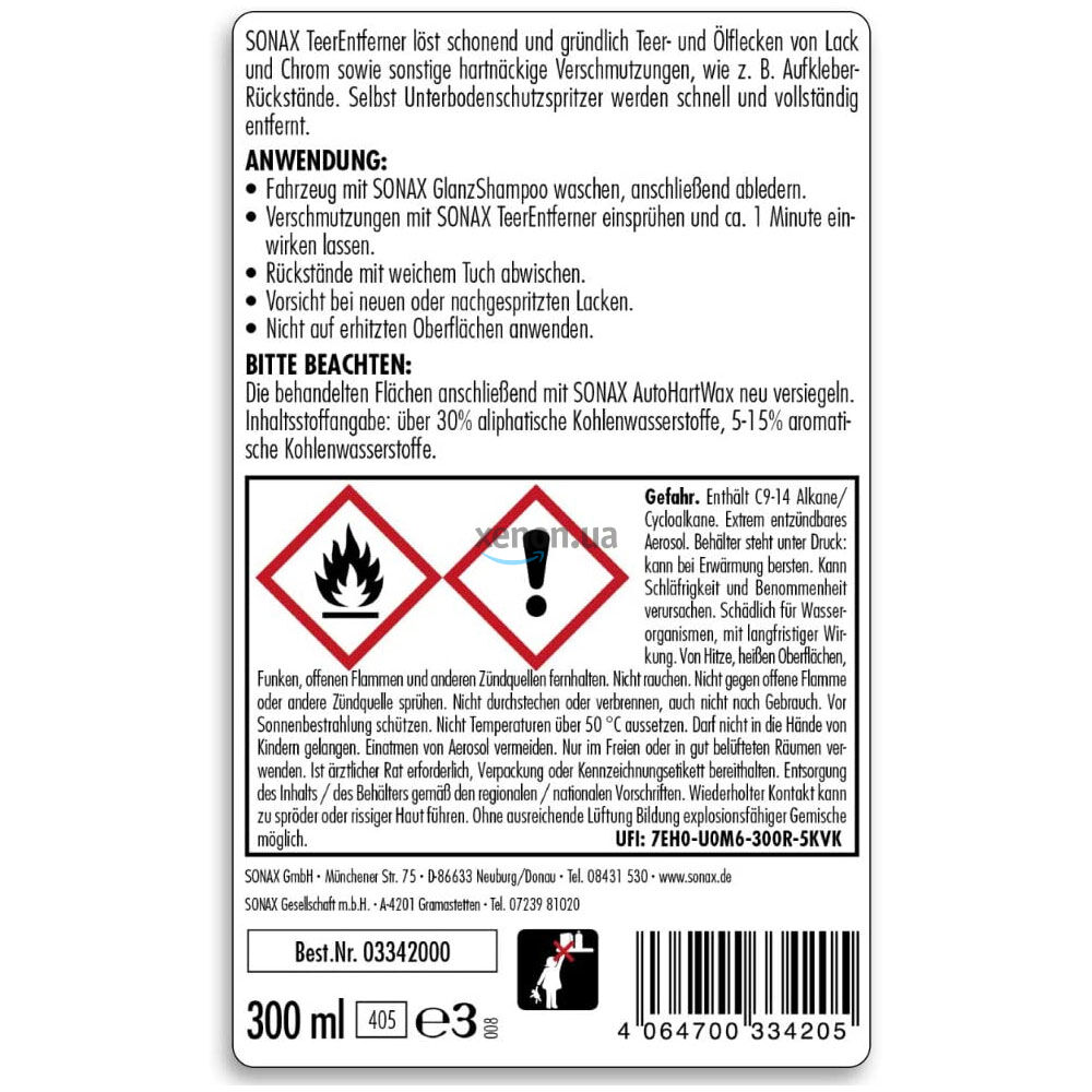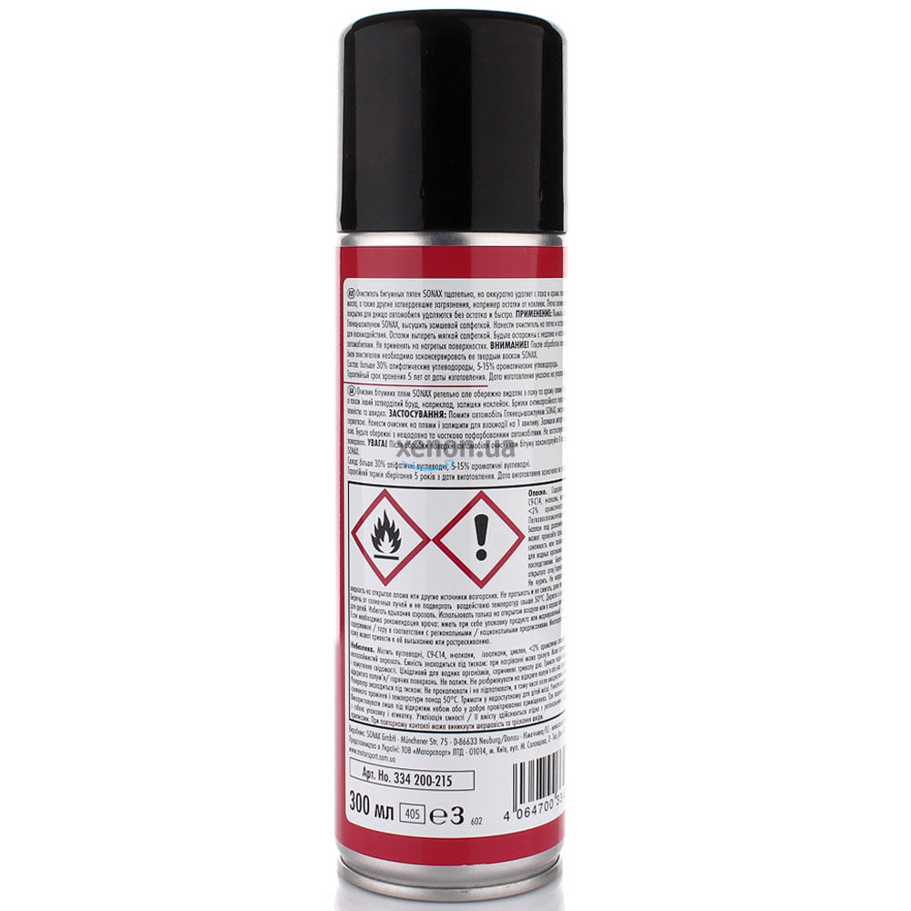 Средство для удаления битума SONAX Tar Remover (Teerentferner) 300 мл 334200 бережно и тщательно удаляет смолу и масляные пятна с лакокрасочного покрытия и хрома, а также другие стойкие загрязнения, например, остатки наклеек. Быстро и полностью удаляются даже брызги от защиты днища (битум, каучук, мовиль).