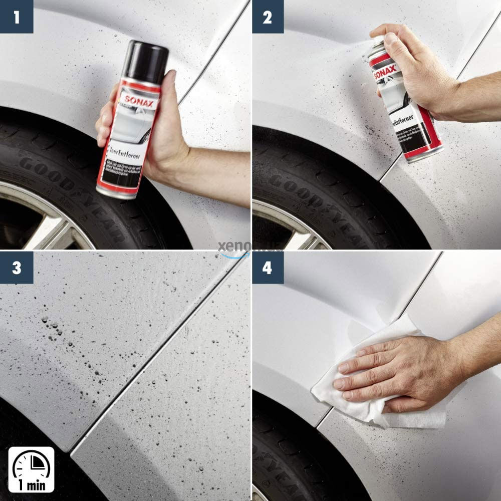 - Распылите на загрязнение средством для удаления битума SONAX и дайте ему подействовать примерно на 1 минуту.