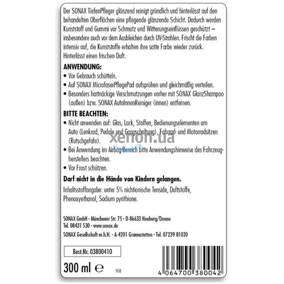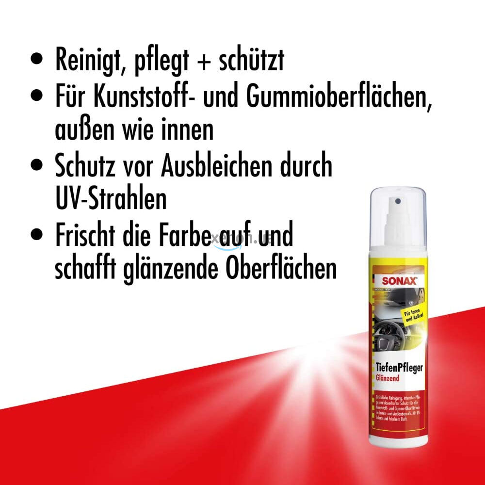 Средство SONAX Tiefenpfleger Glanzed 380041 300 мл очищает, ухаживает, защищает пластиковые и резиновые поверхности, как в салоне автомобиля, так и снаружи. Эмульсия проникает глубоко в обрабатываемую поверхность, надолго защищая пластик и резину от негативных воздействий окружающей среды, в особенности от УФ и озона. Обладает антистатическими свойствами и освежает цвет. После обработки создает блестящую глянцевую поверхность.