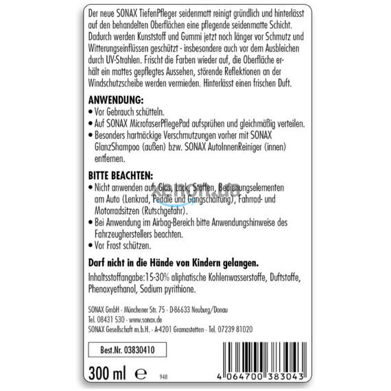 Средство SONAX Tiefenpfleger Seidenmatt 383041 300 мл очищает, ухаживает, защищает пластиковые и резиновые поверхности, как в салоне автомобиля, так и снаружи. Эмульсия проникает глубоко в обрабатываемую поверхность, надолго защищая пластик и резину от негативных воздействий окружающей среды, в особенности от УФ и озона. Обладает антистатическими свойствами и освежает цвет. После обработки создает шелковисто-матовую поверхность.