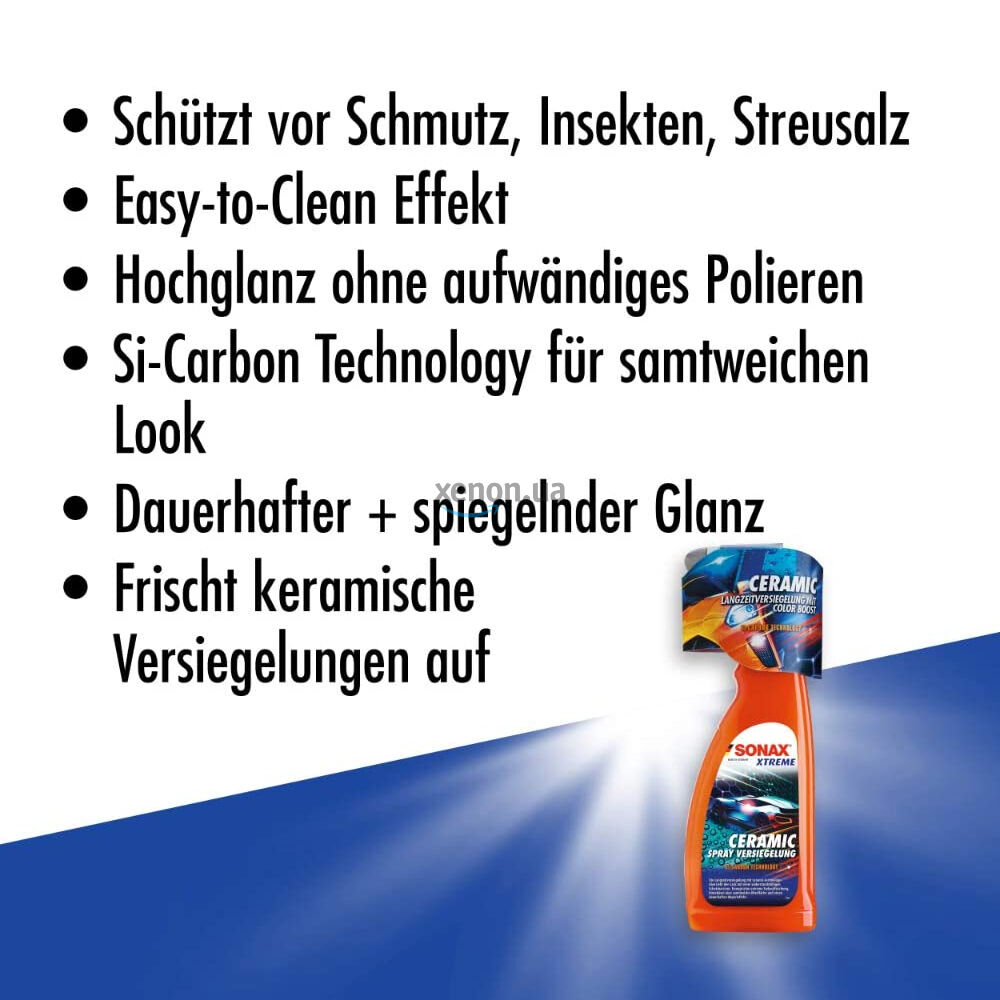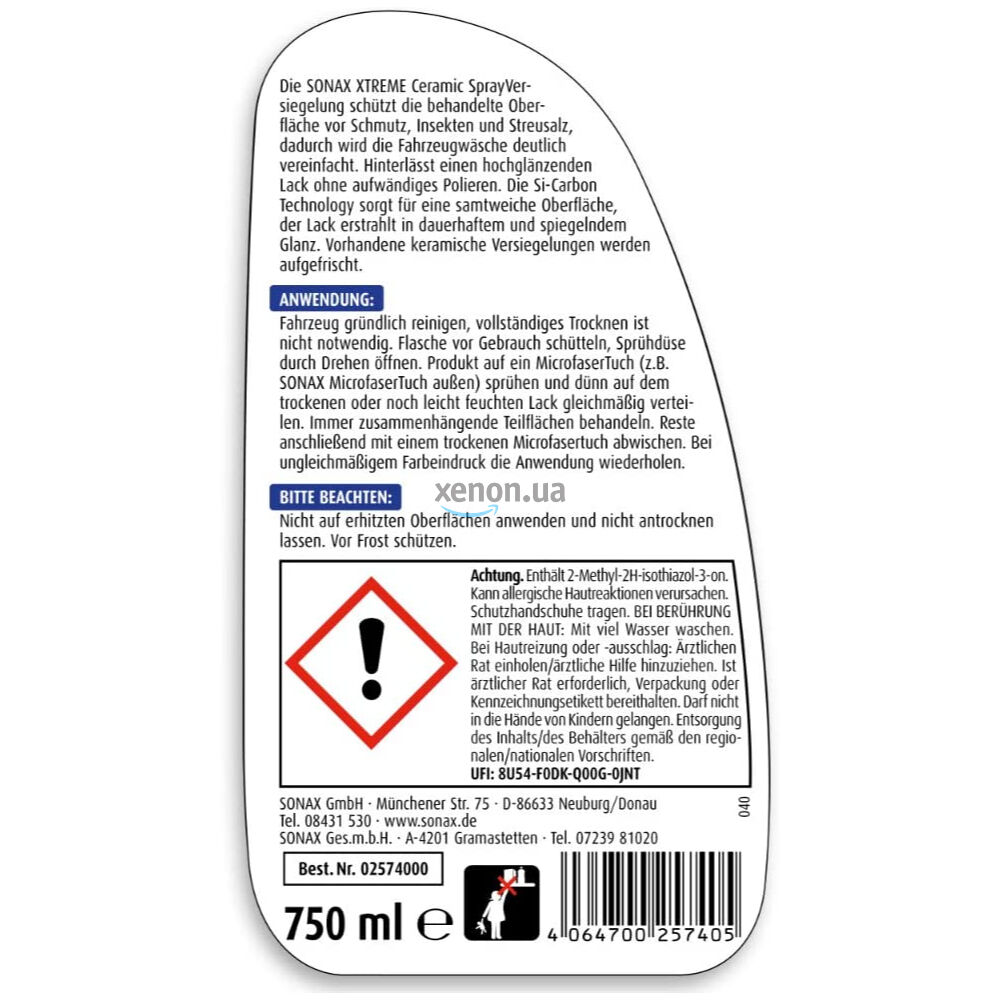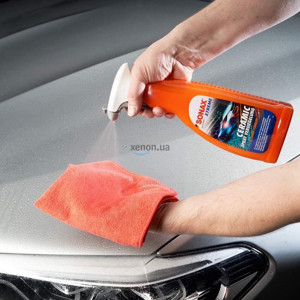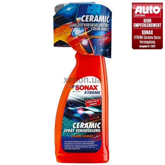Керамический герметик кузова SONAX XTREME Ceramic Spray Coating Versiegelung 750 мл 257400. Герметик XTREME Ceramic Spray защищает обработанную поверхность от грязи, насекомых и дорожной соли, значительно облегчая мойку автомобиля. Оставляет глянцевую поверхность без необходимости полировки. Технология Si-Carbon обеспечивает бархатисто-мягкую поверхность, краска сияет стойким и отражающим блеском. Существующие керамические пломбы обновляются.