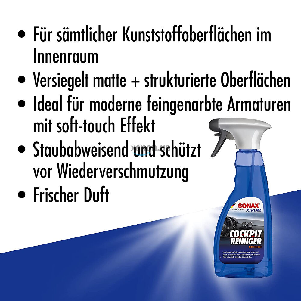 Интенсивный очиститель пластика матовый SONAX XTREME Cockpit Reiniger 500 мл 283241. Серия Sonax Xtreme для интенсивной очистки глубоких загрязнений и защиты пластика. Средство для очистки всех пластиковых деталей салона вашего автомобиля. Обладает антистатическими свойствами, предотвращая электризацию поверхностей. Также обладает пыле-отталкивающими свойствами. Идеально подходит для пластика с soft-touch покрытием.Очиститель придает приятный матовый эффект обрабатываемым деталям интерьера. Не содержит силикон. В новой экономичной 500 мл. упаковке с удобным триггером.