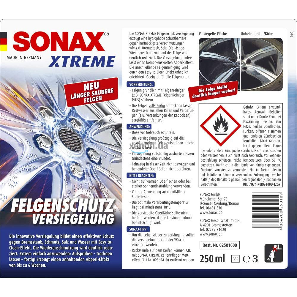 Используя защитное покрытие SONAX XTREME NanoPro 236100, можно создать на легкосплавных и стальных дисках невидимый надежный нанослой, устойчивый к загрязнениям. Средство защищает поверхность от воздействия влаги, грязи и соли. Производитель – Германия.