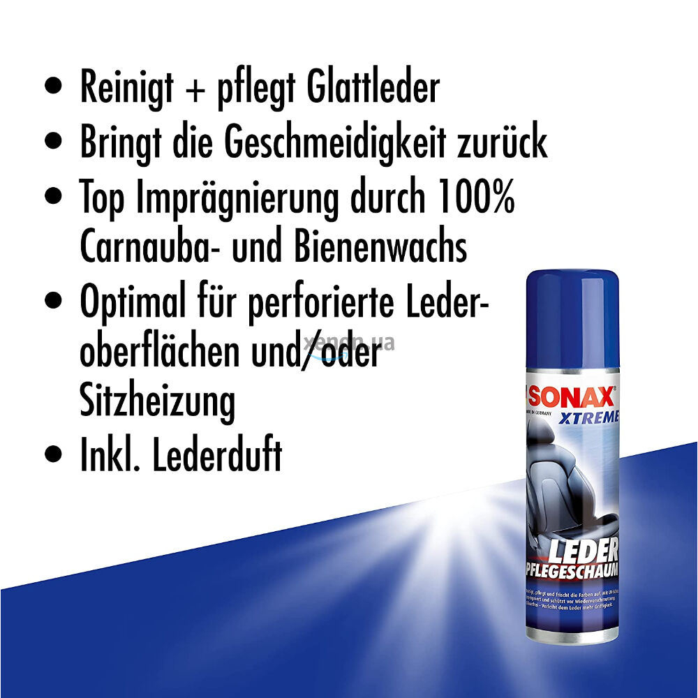 SONAX Xtreme Leder PflegeSchaum 289100 - это пена для интенсивной очистки кожаного салона и кожаных деталей интерьера также может быть использован и в быту. Например, для очистки кожаного кресла или дивана. Сделана по технологии NanoPro для максимально эффективной очистки.
