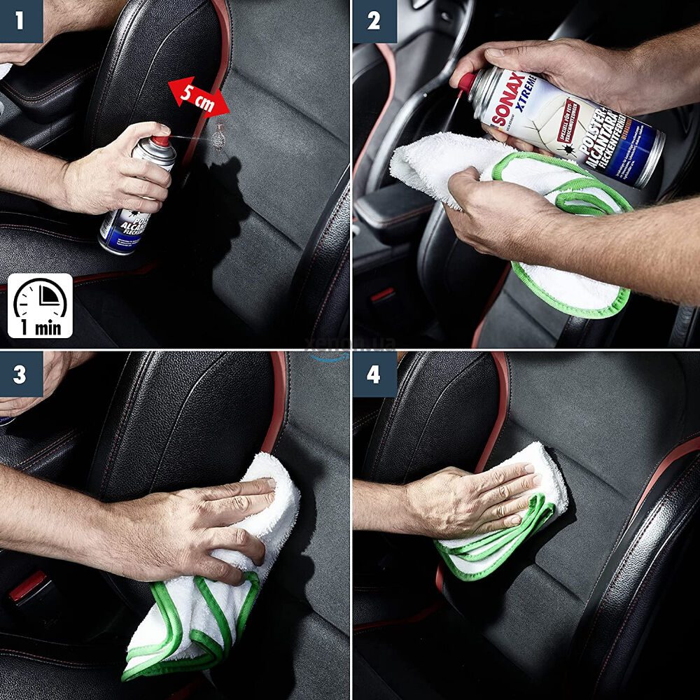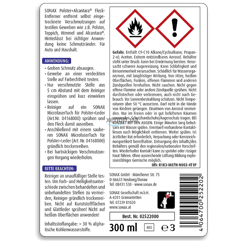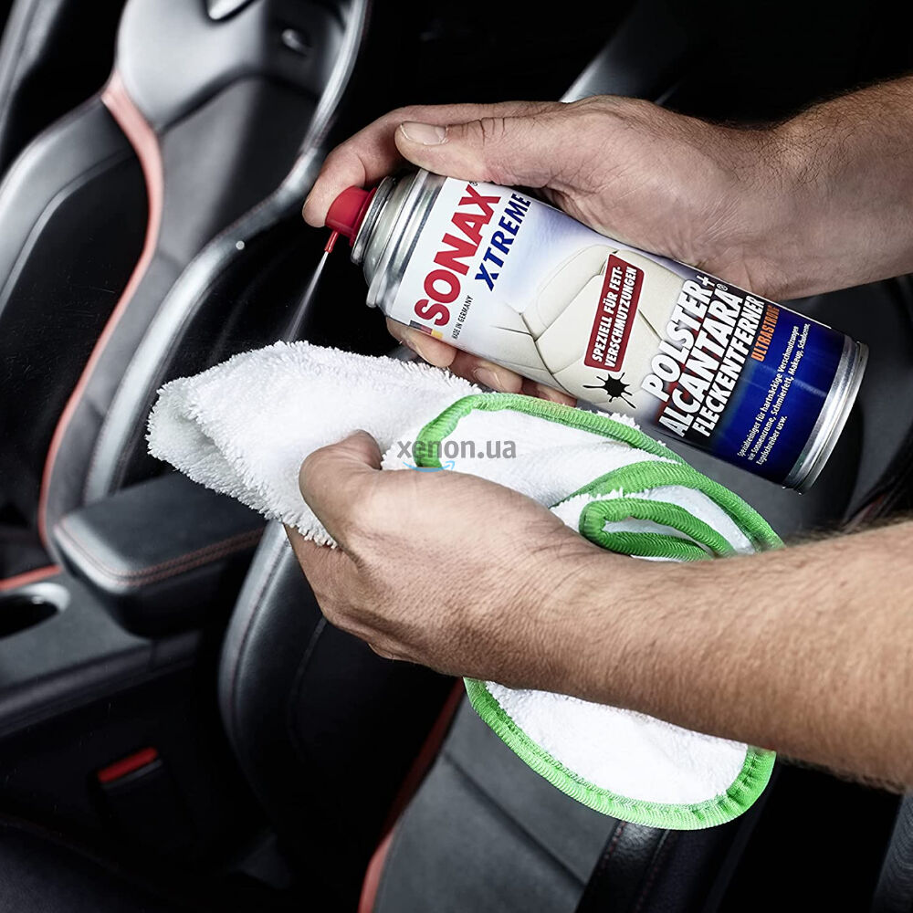SONAX XTREME Polster + Alcantara Fleckentferner 300 мл 252200 пятновыводитель для тканевой обвики и алькантары от стойких загрязнений, таких как солнцезащитный крем, жир, косметика, крем для обуви, шариковая ручка и прочая сильно въевшаяся грязь. Удаляет даже сухие загрязнения со всех текстильных тканей, например, обивка салона, ковер, обивка потолка и чувствительные поверхности, такие как алькантара.