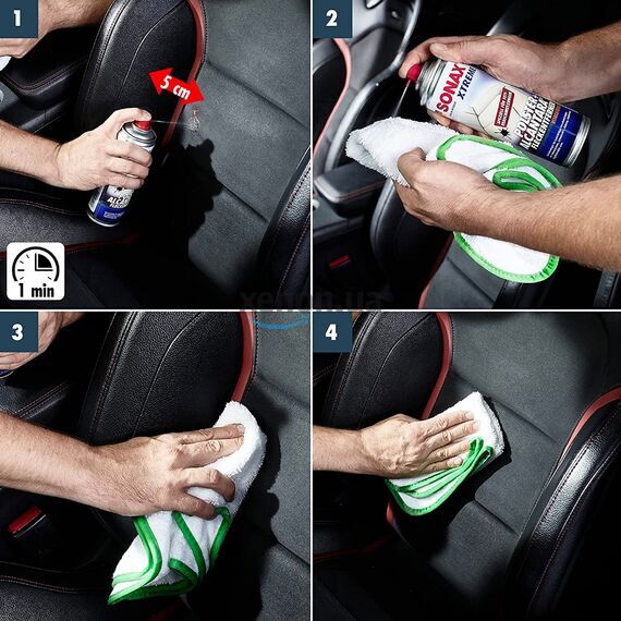 - Распылите чистящее средство на салфетку из микрофибры SONAX и протрите им пятно;