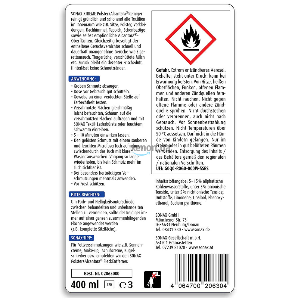 С помощью очистителя SONAX XTREME Polster+Alcantara Reiniger (206300) можно тщательно и и аккуратно очистить весь текстиль в салоне автомобиля, такой как сидения, обивка, панели, карты дверей, потолки, ковры, защитные чехлы и чувствительные поверхности типа Alcantara®. В то же время содержащееся в очистителе средство для устранения запаха быстро и навсегда устраняет неприятные запахи сигаретного дыма, запахи животных, пролитого испорченого молока и т.д. Остается лишь легкий и свежий запах. Не оставляет следов и пятен на поверхности. С помощью очистителя можно удалить даже стойкие пятна, такие как от шоколада, мороженного, колы, кофе, кетчупа и т.д. Обновляет и освежает цвета вашего текстиля.