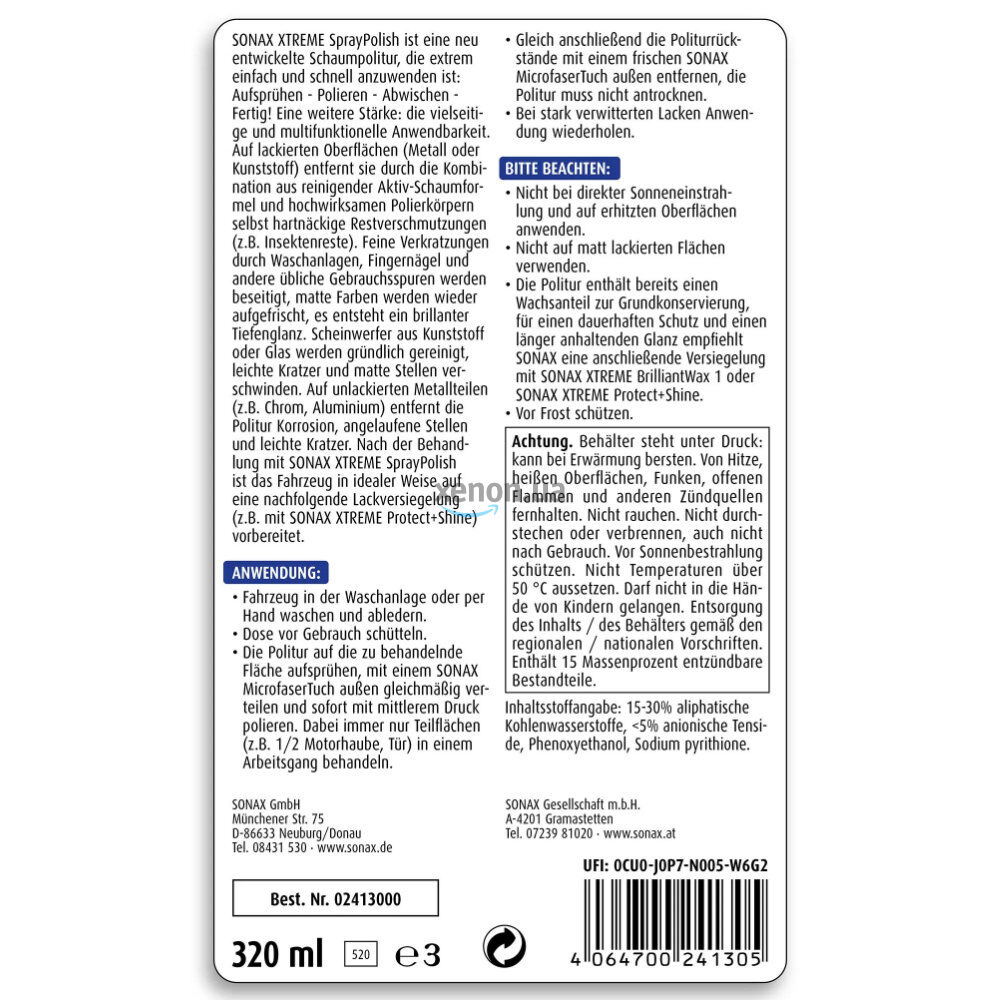 Пенный полироль-очиститель SONAX XTREME SprayPolish (241300) очень лёгок в использовании: распылите — отполируйте — протрите — готово! Тщательная глубокая очистка поверхности и мощная полировка за один прием обеспечивается активной формулой пены. Средство удаляет стойкие остатки грязи, остатки насекомых на окрашенных поверхностях (металлических или пластиковых), сглаживает легкие царапины от автомоек и другие обычные следы износа, загрязнение фар из пластика или стекла, коррозию, темные пятна и небольшие царапины на неокрашенных металлических частях, таких как хром, алюминий.