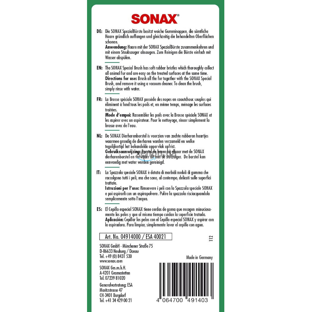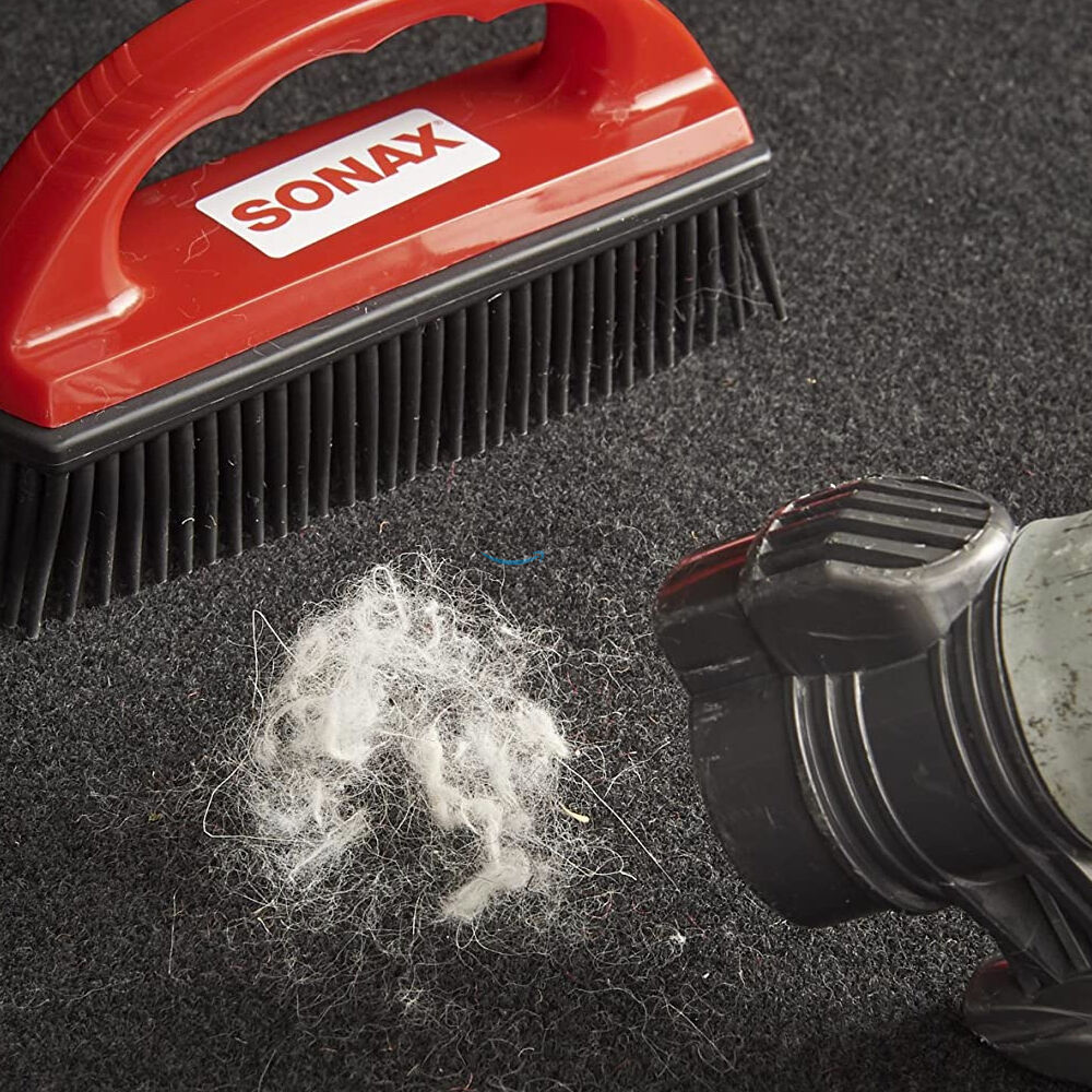 Специальная щетка SONAX для удаления шерсти - это профессиональное решение для владельцев домашних животных. Уникальная резиновая щетина эффективно собирает шерсть с любых текстильных поверхностей в салоне автомобиля, не повреждая материал.