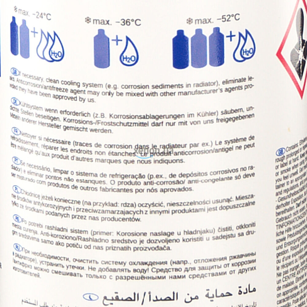 Максимально возможная температура, при которой действует антифриз, предотвращая замерзание охлаждающей жидкости, составляет около –52 °C, при соотношении компонентов в смеси 2:1 (концентрат : вода). Чистый концентрат снижает охлаждающую способность системы охлаждения на 50 % по сравнению со смесью с соотношением компонентов 1:1.