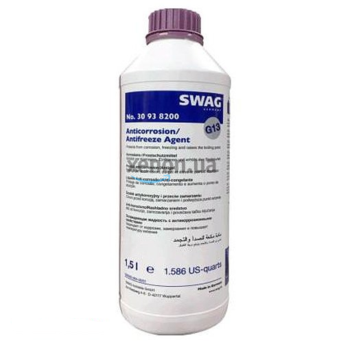 Концентрат антифриза,относится к классу G13 и является универсальным продуктом, который можно применять как в современных автомобилях, с легкосплавными системами охлаждения и двигателями, так и транспорте прошлых лет выпуска – с системами из железа и чугуна. Производится Swag G13 фиолетовый концентрат 30 93 8200 1,5л на основе пропиленгликолей, дополненных активными ингибиторами коррозии и другими присадками, которые не только препятствуют замерзанию или закипанию системы, но также эффективно защищают ее от поражения ржавчиной и засорения.