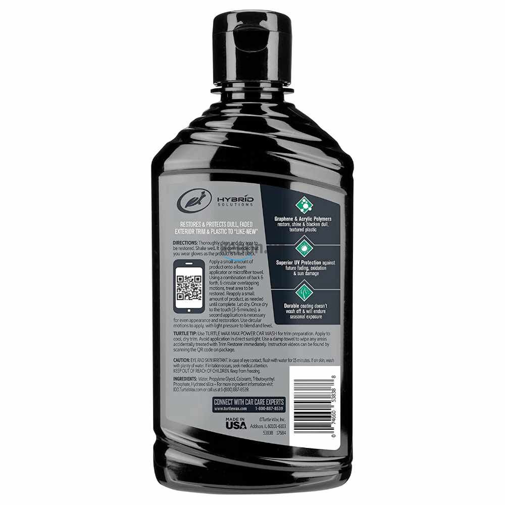 Hybrid Solutions Graphene Acrylic Trim Restorer — это усовершенствованная формула, которая восстанавливает и защищает тусклую, выцветшую внешнюю отделку и пластик. Сочетание графена и акриловых полимеров придает блеск и затемняет тусклый текстурированный пластик, обеспечивая превосходную защиту от ультрафиолетового излучения. Это прочное покрытие не смывается и выдержит сезонное воздействие. Сухая на ощупь через несколько минут после нанесения. Graphene Acrylic Trim Restorer также хорошо защищает новую отделку салона и пластик от выцветания из-за непогоды, мойки автомобилей и дорожных солей.