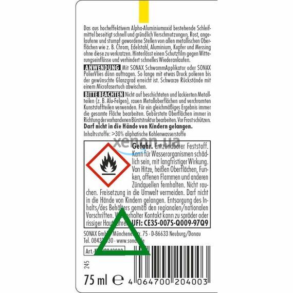 Абразив Sonax, состоящий из высокоэффективного альфа-оксида алюминия, быстро и тщательно удаляет грязь, ржавчину, тусклые участки со всех металлических поверхностей, таких как, например, хром, нержавеющая сталь, алюминий, медь и латунь без царапин. В то же время оставляет защитную пленку, которая защищает обработанную поверхность от воздействия отрицательных погодных условий и предотвращает быстрое повторное окисление или загрязнение. Для автомобилей, велосипедов, домашнего хозяйства, хобби и ремесел.