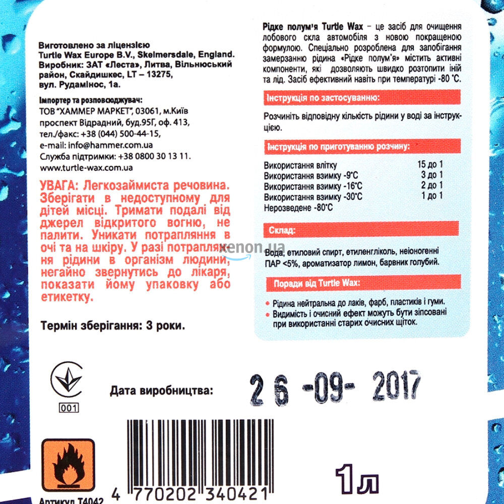 Омыватель стекла зимний концентрат -80 ºC Turtle Wax 1 л – это суперконцентрированный омыватель стекла автомобиля, разработанный специально для зимних условий, чтобы справиться с любыми загрязнениями, которые могут возникнуть на вашем пути. Разработан по известным стандартам эффективности Turtle Wax, высоко ценимым автовладельцами по всему миру. В его составе присутствуют только этиловые спирты, безопасные для человека и не вредящие форсункам, трубкам и другим элементам системы автомобиля. Специально подготовленная вода, моющие детергенты, угнетатели пены и другие компоненты патентованной формулы Turtle Wax гарантируют рабочую температуру омывателя, быструю растопку льда на стекле, быстрое смывание солей, масляных пленок и другой грязи, отсутствие появления пленки после прохода стеклоочистителей.. Омыватель в форме концентрата позволяет гибко определять требуемую температуру готового раствора соответственно окружающей температуре.