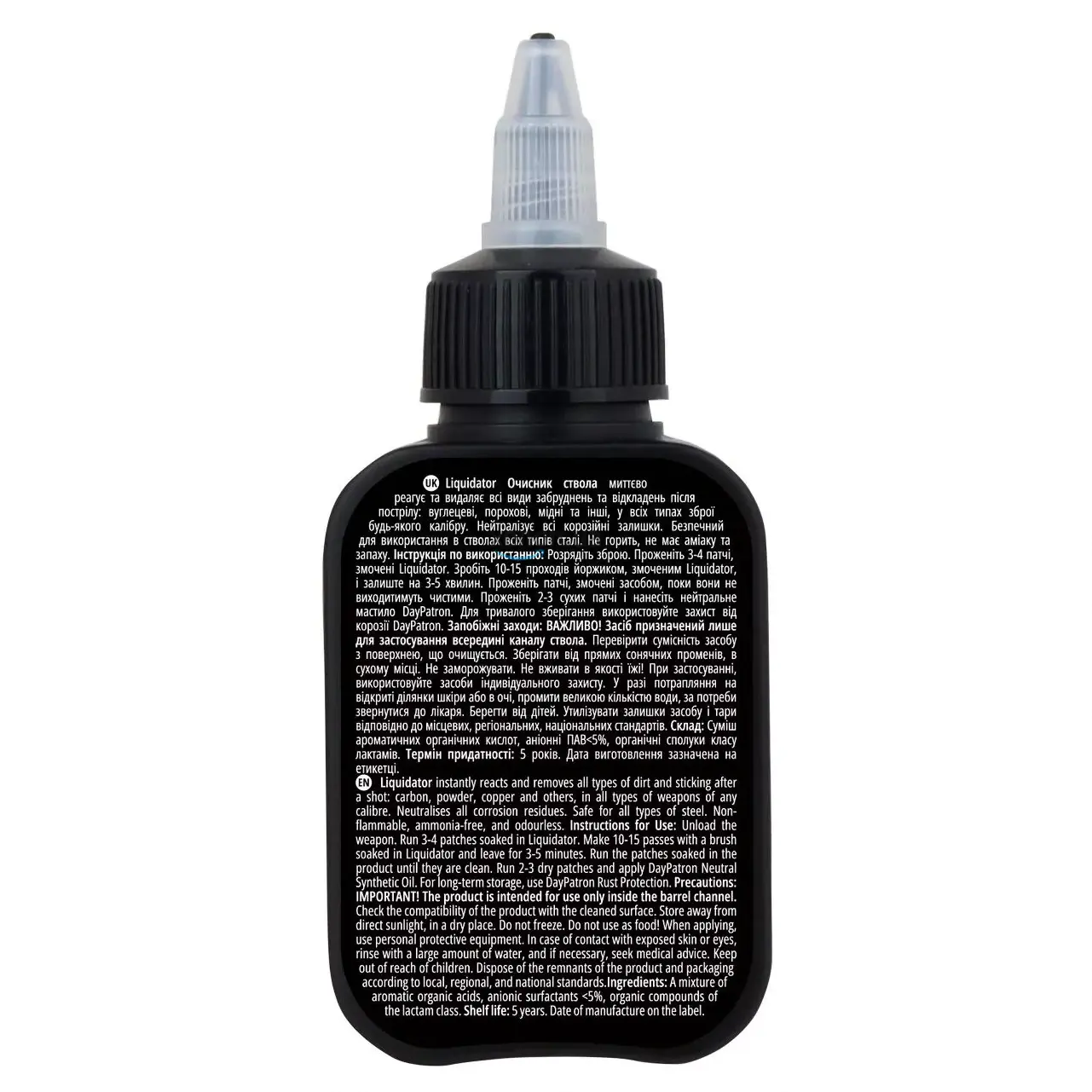 Засіб для чищення (очисник ствола) DAY PATRON Liquidator/Ліквідатор - потужний, високопродуктивний засіб, який миттєво вступає в реакцію і видаляє всі види забруднень та відкладень після пострілу: вуглецеві, порохові, мідні, свинцеві та інші залишки, у всіх видах нарізної та гладкоствольної зброї малого та великого калібру. Ефективно нейтралізує всі корозійні залишки, короткостроково запобігаючи появі корозії.